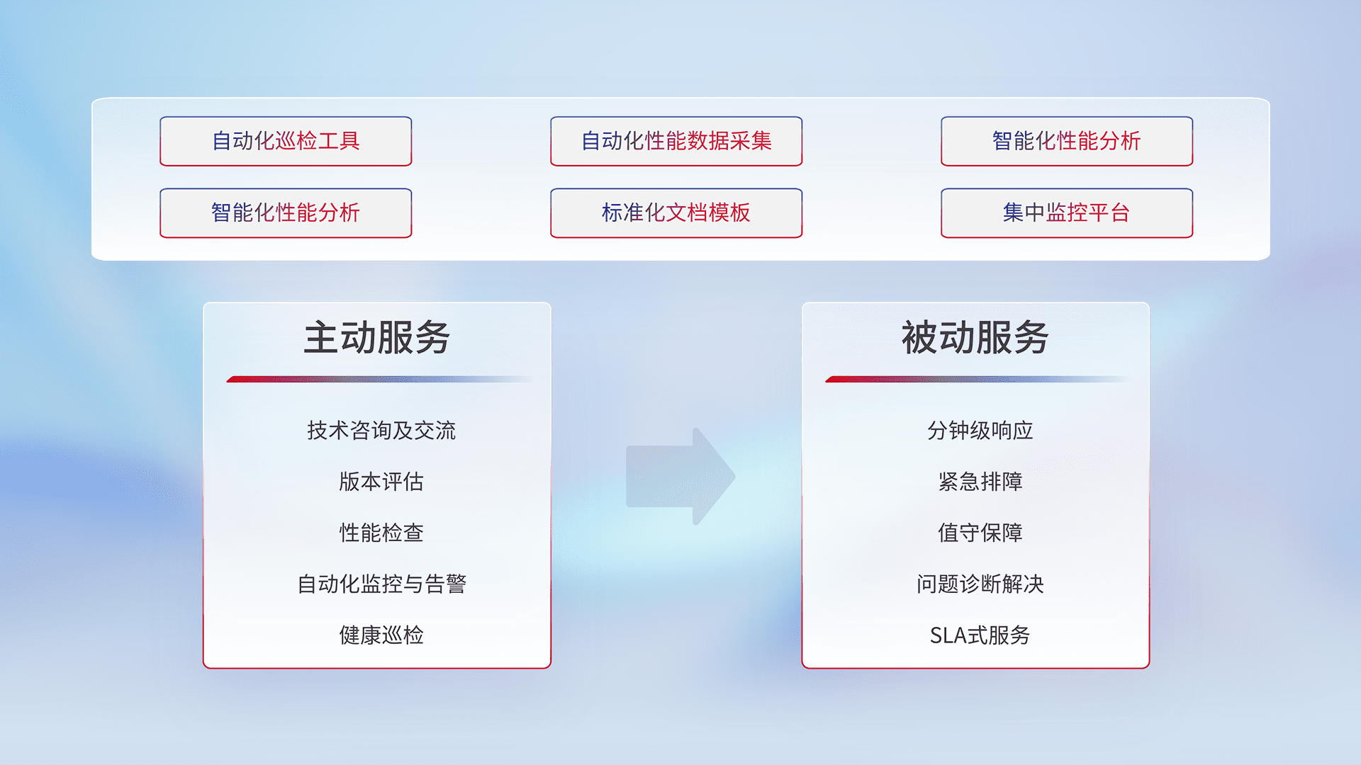 智能化工具和标准化文档,,,保障服务质量,,提供主动服务(包含技术咨询、、版本评估、、、、性能检查、、、自动化监控与告警、、健康巡检)和被动服务包含(分钟级响应、、紧急排障、、、、值守保障、、、、问题诊断解决、、SLA服务)。。